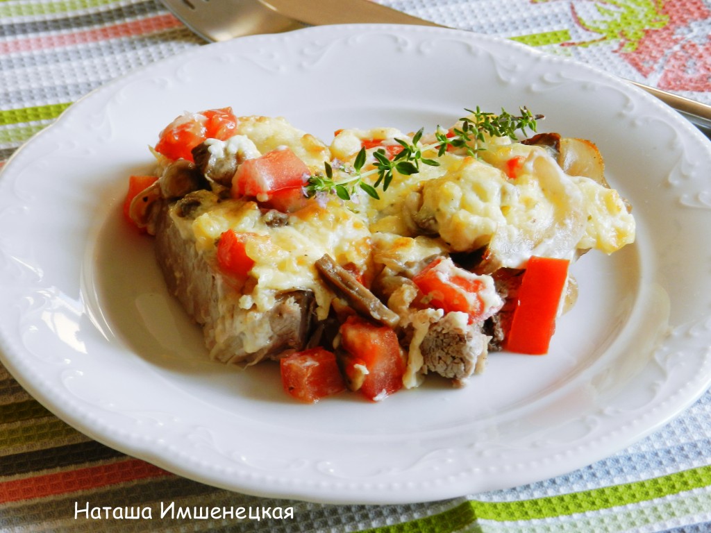 Свинина, запеченная с грибами и сыром по этому рецепту, называется "Свинина по-пански". Недавно я попробовала это блюдо в одном кафе города Симферополя и удивилась, как можно такое простое блюдо приготовить так не вкусно. Пришлось дома повторять, чтобы накормить свою семью вкусным блюдом. Потому что мясо, грибы, помидоры и сыр - это беспроигрышное сочетание продуктов, а готовить надо с любовью, вот и весь секрет!