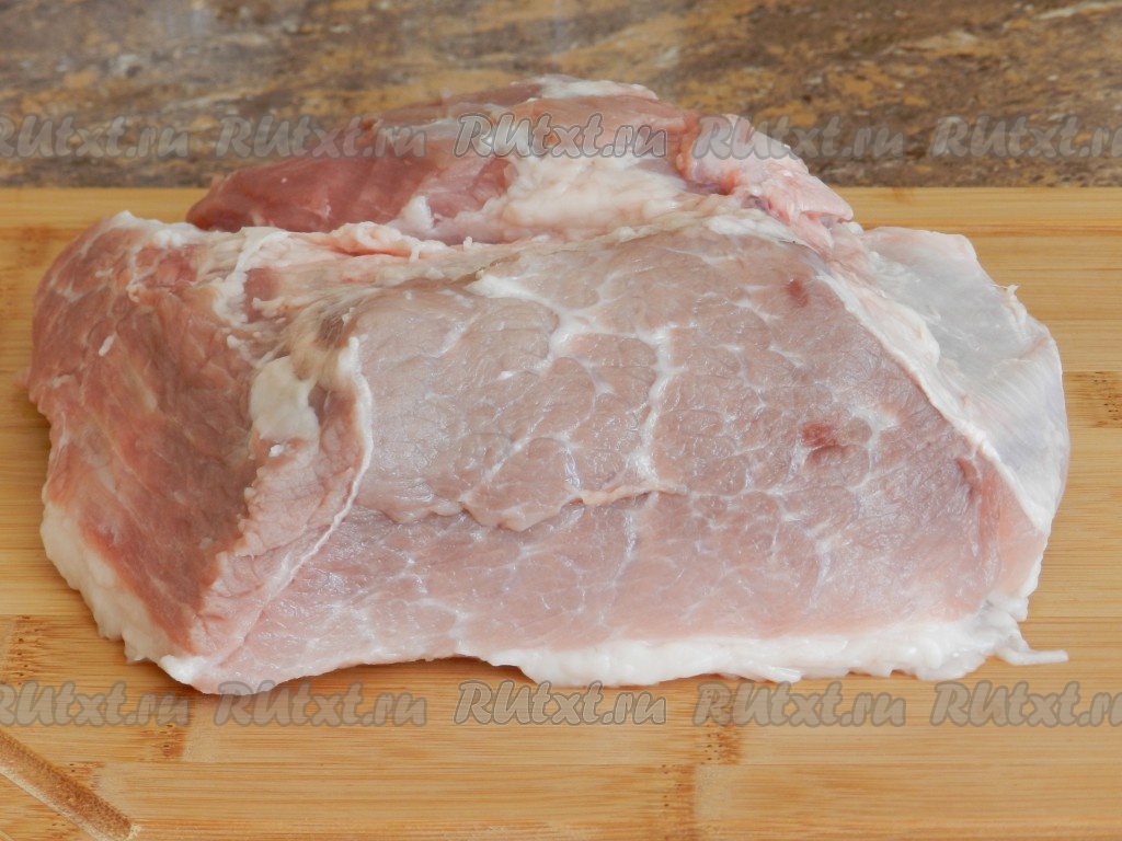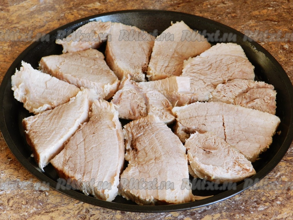 Когда свинина сварится, вынуть ее из бульона, немного остудить и нарезать на порционные кусочки. Форму для выпечки слегка смазать маслом. Выложить мясо.