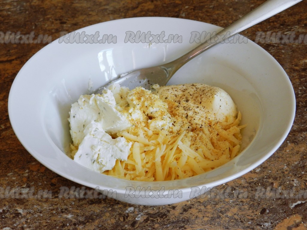 Для приготовления сырного соуса смешать натёртый полутвёрдый сыр, творожный сыр, сметану, соль и перец.