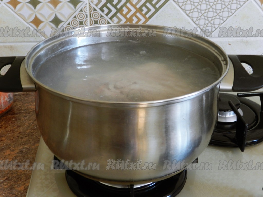 В кастрюле вскипятить воду, поместить в кипяток мясо, довести до кипения, снять пену. Добавить одну очищенную луковицу и черный перец горошком. Варить на медленном огне до готовности мяса, около 1 часа.
