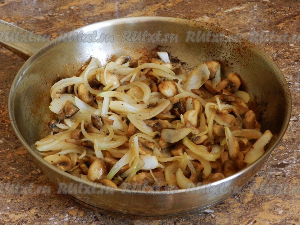 Обжарить на растительном масле сначала шампиньоны до испарения жидкости и легкого золотистого оттенка, не забывая помешивать, затем добавить лук и обжарить все вместе. Лук тоже должен стать золотистого цвета, посолить и поперчить.