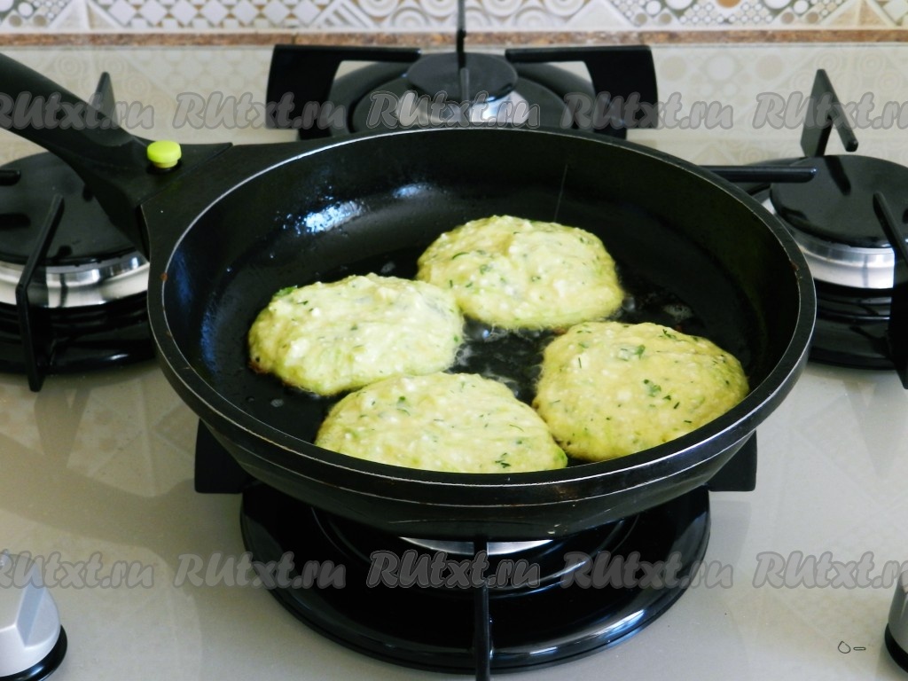В сковороде разогреть растительное масло. В разогретое масло выкладывать по 1-1,5 столовых ложки кабачково-творожного теста, жарить оладьи до подрумянивания снизу на среднем огне.