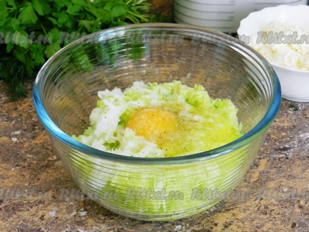 В миску с кабачково-луковой массой добавить сырое яйцо, посолить и поперчить по вкусу, перемешать вилкой.
