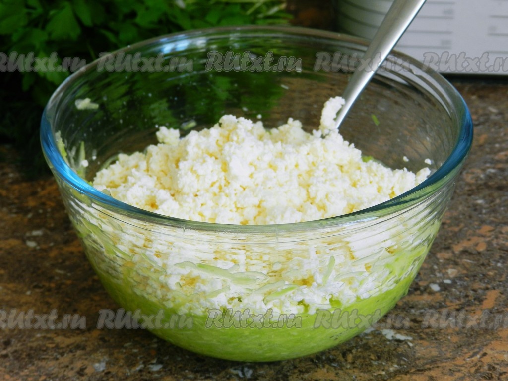 Постепенно добавлять муку и вмешивать её в тесто. Муки может понадобиться чуть больше, если остался сок от кабачка или творог влажный. Консистенция теста для оладий должна напоминать сметану средней густоты.