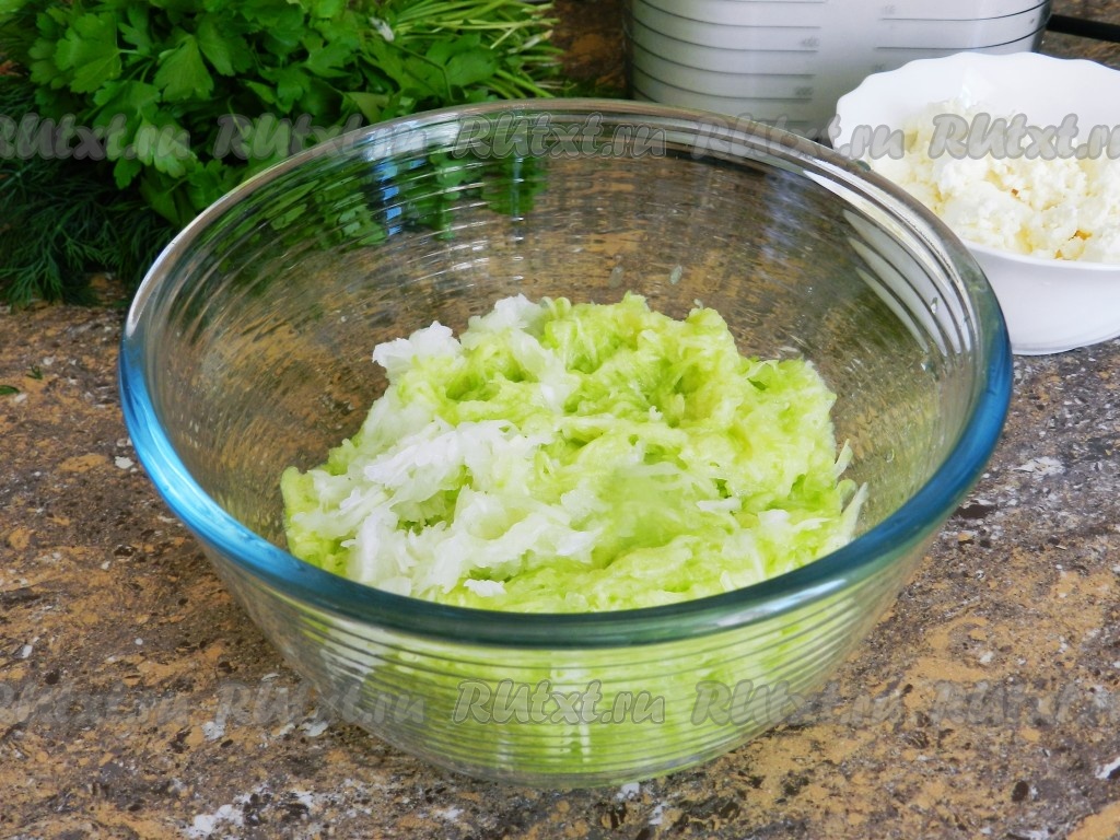 Кабачок (с молодого кабачка шкурку можно не снимать) и очищенный лук натереть на крупной тёрке в глубокую миску. Затем немного отжать кабачкову-луковую массу руками, выделившийся сок слить.