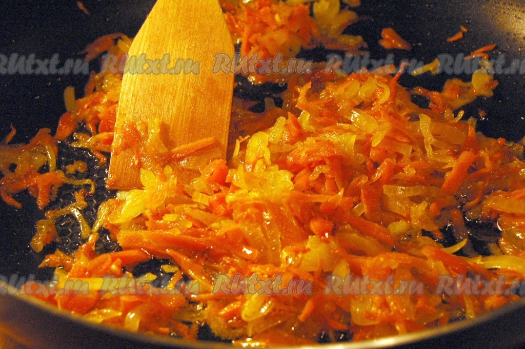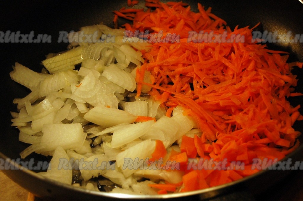 Морковь натереть на крупной терке, лук нарезать небольшими кубиками.