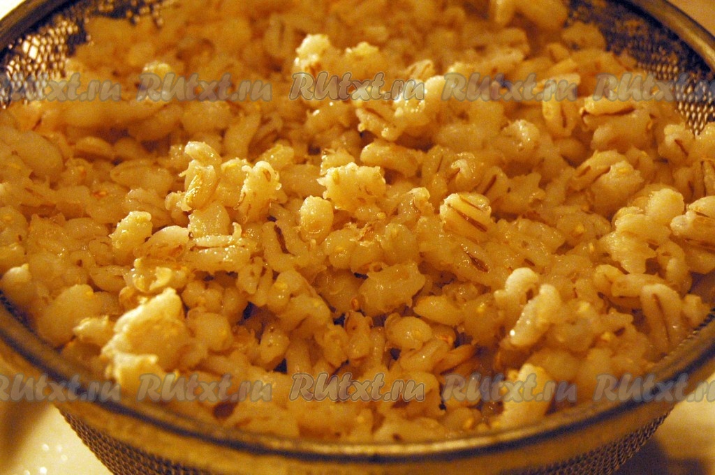 Перловую крупу слегка промыть, залить теплой водой и поставить варить в отдельной кастрюльке на 30 минут, пока крупа полностью не разварится.