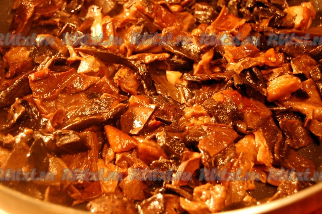 Когда грибы сварятся, вытащить их шумовкой из кастрюли, а в грибной бульон отправить картофель, морковь с луком и перловую крупу. Грибы мелко нарезать и обжарить на растительном масле.