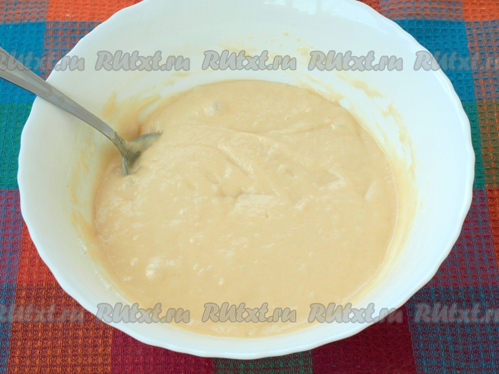 В тесто просеять муку и разрыхлитель. Перемешать до однородности, тесто по консистенции должно напоминать густую сметану. Возможно муки понадобится чуть больше или чуть меньше, главное - контролируйте консистенцию полученного теста.