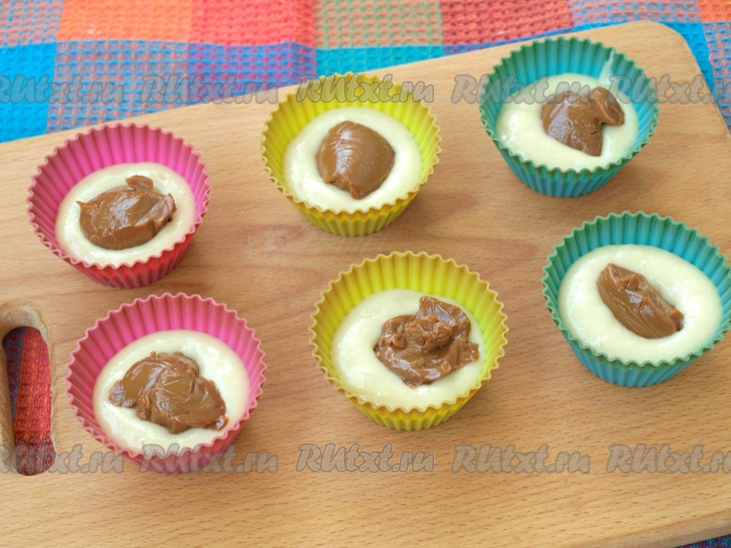 В силиконовые формочки выложить немного теста, на него - по чайной ложечке варёной сгущёнки.