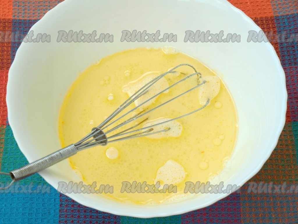 Влить молоко и взбить массу венчиком.