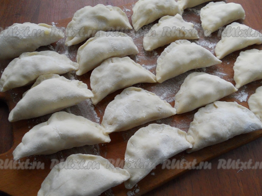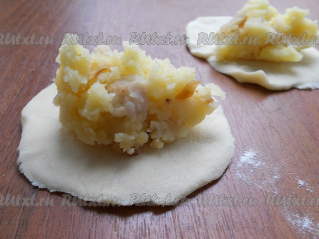 Далее тесто для вареников обмять, разделить его на небольшие кусочки, раскатать в лепешки. На каждую лепешку поместить по 1 столовой ложке начинки из картофеля и сала.