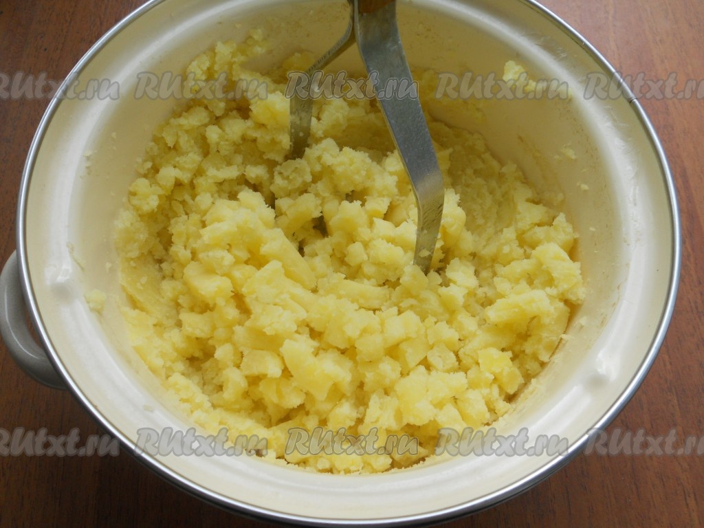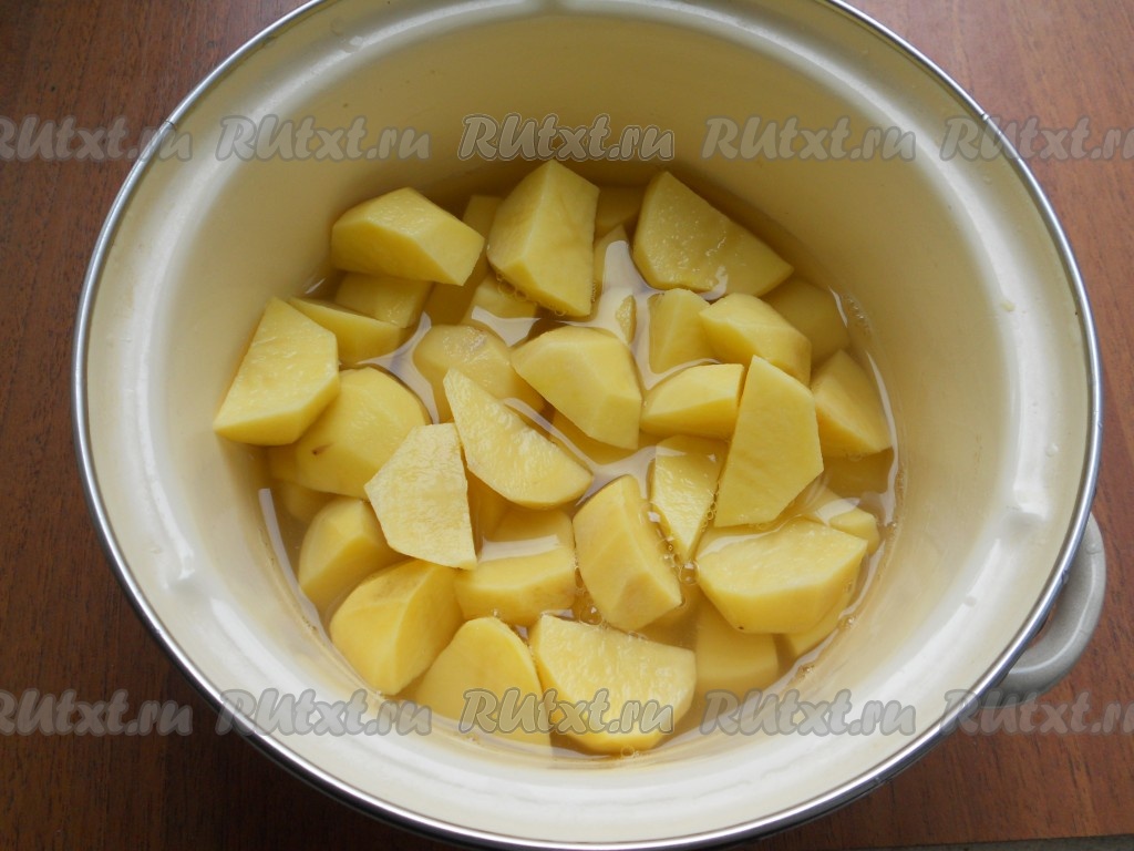 Поставить кастрюлю на огонь и отварить картофель в подсоленной воде до готовности. Воду слить, а картофель растолочь.
