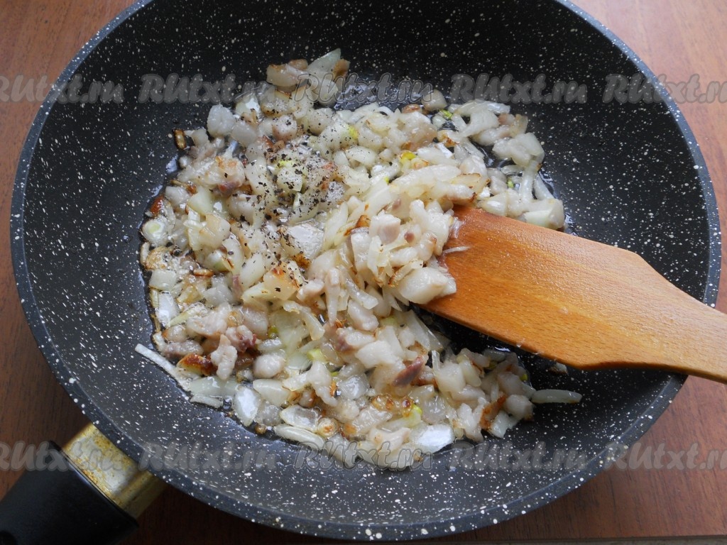 Далее добавить в сковороду мелко нарезанный репчатый лук и обжарить до золотистости, иногда помешивая, затем поперчить.