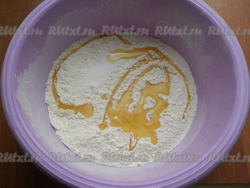 Для приготовления теста просеять в миску муку, добавить соль и растительное масло. Влить горячую воду (не крутой кипяток) в муку и быстро замесить ложкой тесто.