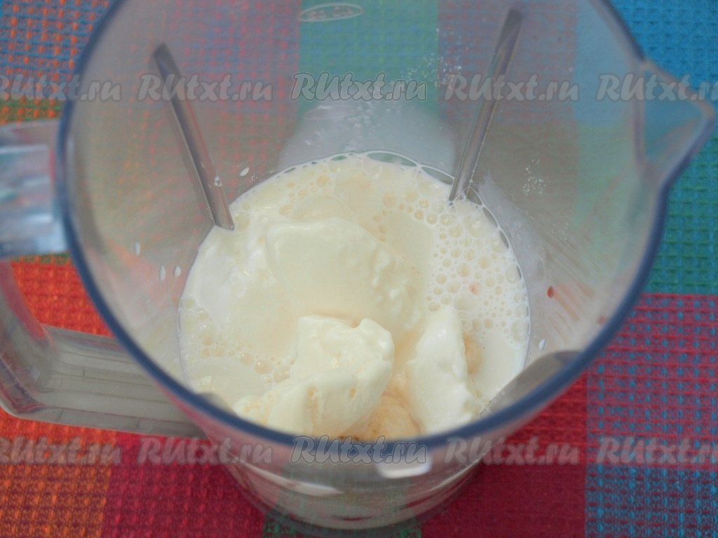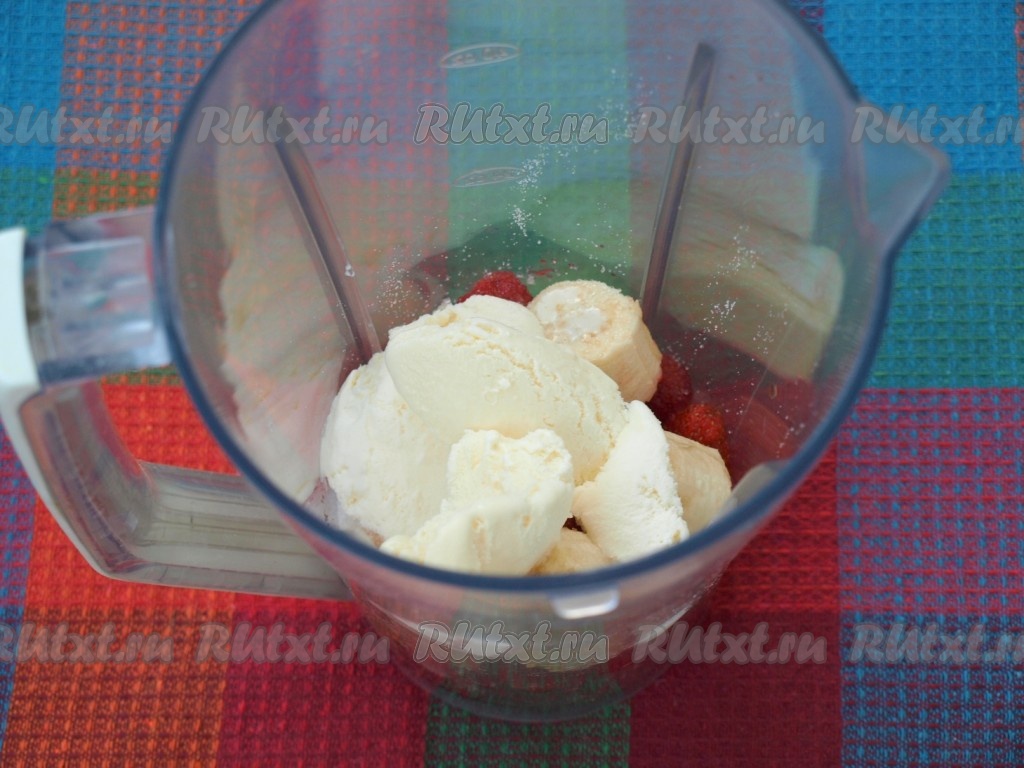 Клубнику и банан сложить в чашу блендера, добавить к ним сахар и мороженое.