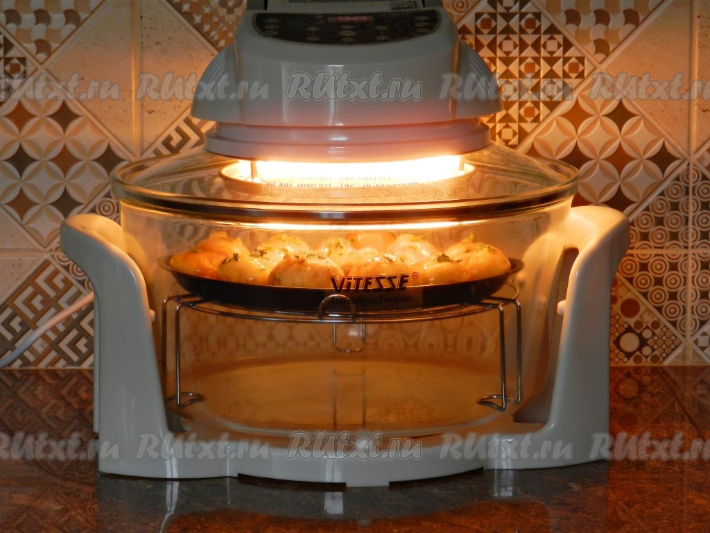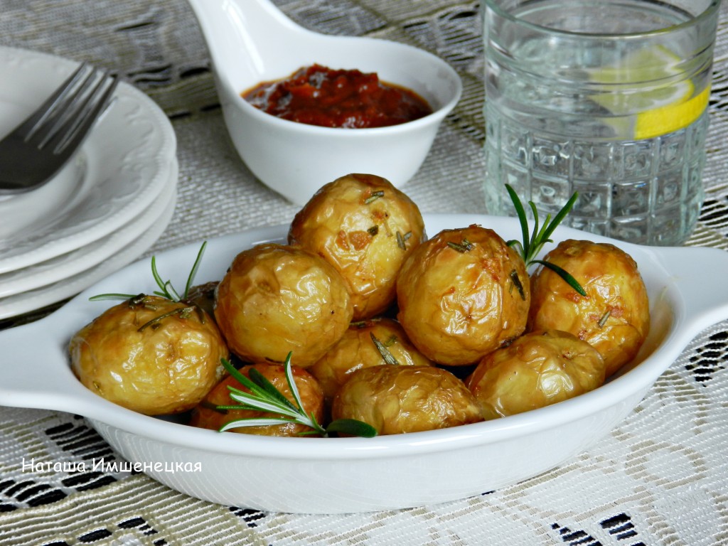 Запекать при температуре 200 градусов 30 минут. В процессе запекания перевернуть картофелины один раз.