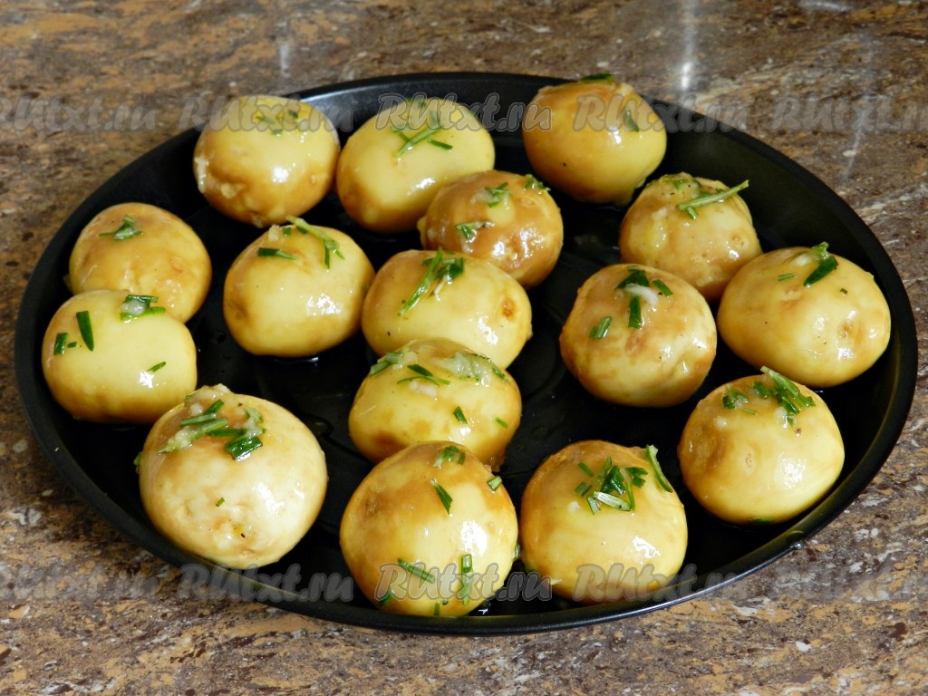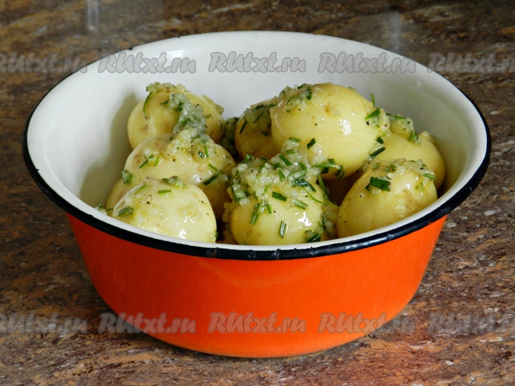 Молодой картофель можно не чистить, его нужно тщательно вымыть, используя щетку. Если картошка не молодая, её лучше очистить. Смешать картофель с масляно-чесночной смесью, чтобы все клубни были покрыты маслом. Оставить на 30 минут, накрыв миску крышкой.