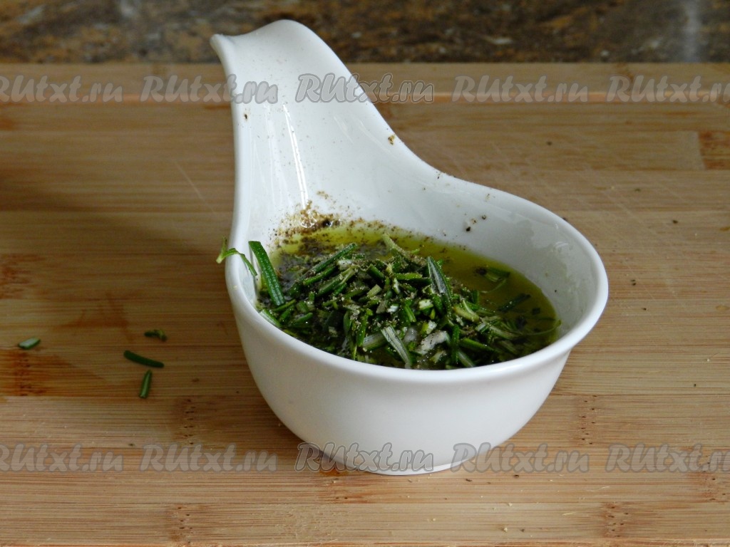 Чеснок пропустить через пресс, розмарин (листики) нарезать. Смешать оливковое масло, соль, перец, чеснок и розмарин.