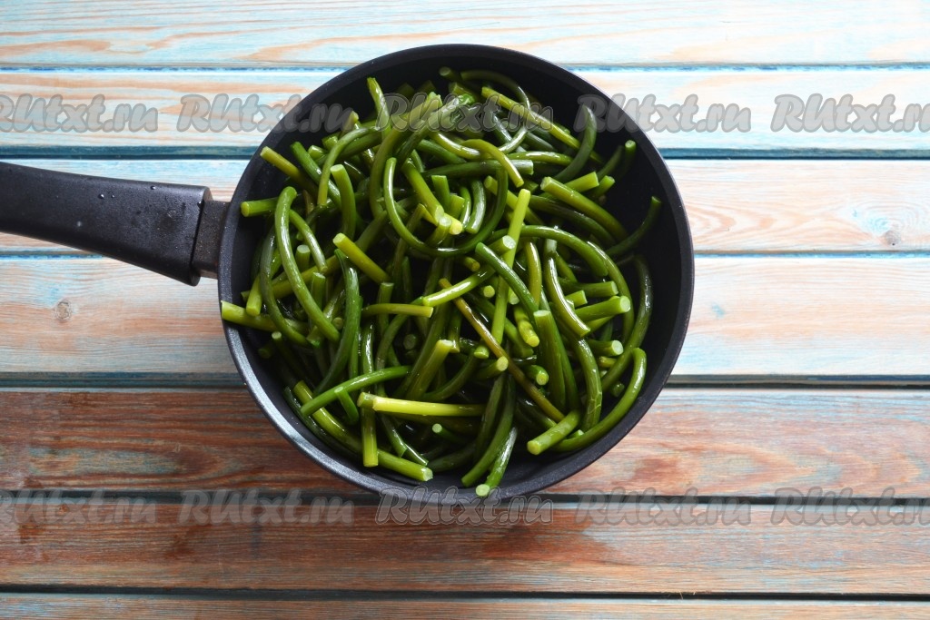 Подготовленные стрелки чеснока солим по вкусу. Сковороду хорошо разогреваем с растительным маслом. Выкладываем стрелки чеснока на сковороду.
