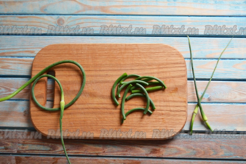 Стрелки хорошо промываем проточной водой. У каждой стрелки чеснока срезаем соцветие (оно нам не понадобится). Нарезаем стрелки на равные кусочки длиной примерно 5-6 сантиметров. Желательно, чтобы на стрелках не было воды, можно их даже обсушить на бумажных полотенцах.