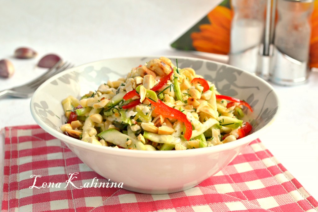 Салат тщательно, но аккуратно перемешать и оставить в прохладном месте на 10 минут. После этого очень вкусный салат из свежих кабачков выложить в салатник, посыпать рубленным жареным арахисом и подать к столу.