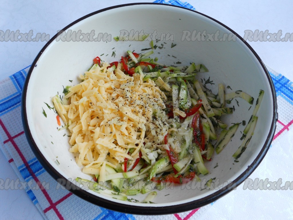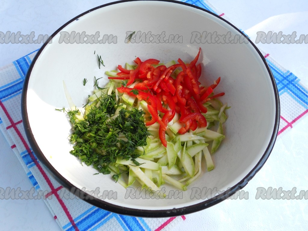 Кабачки посолить немного, добавить нарезанный соломкой сладкий болгарский перец и измельченный свежий укроп.