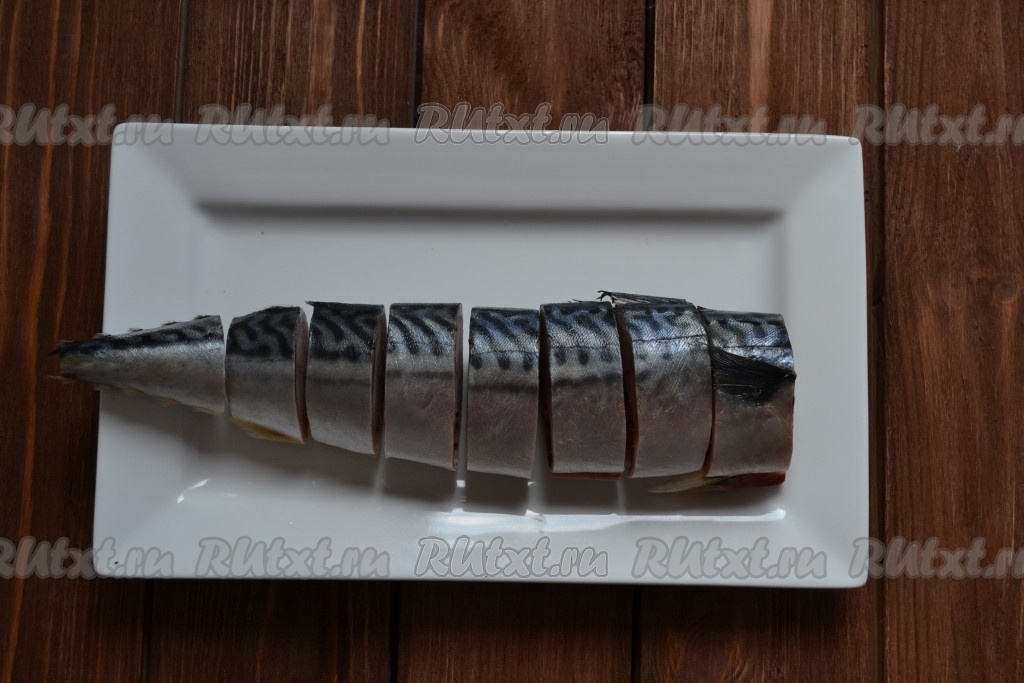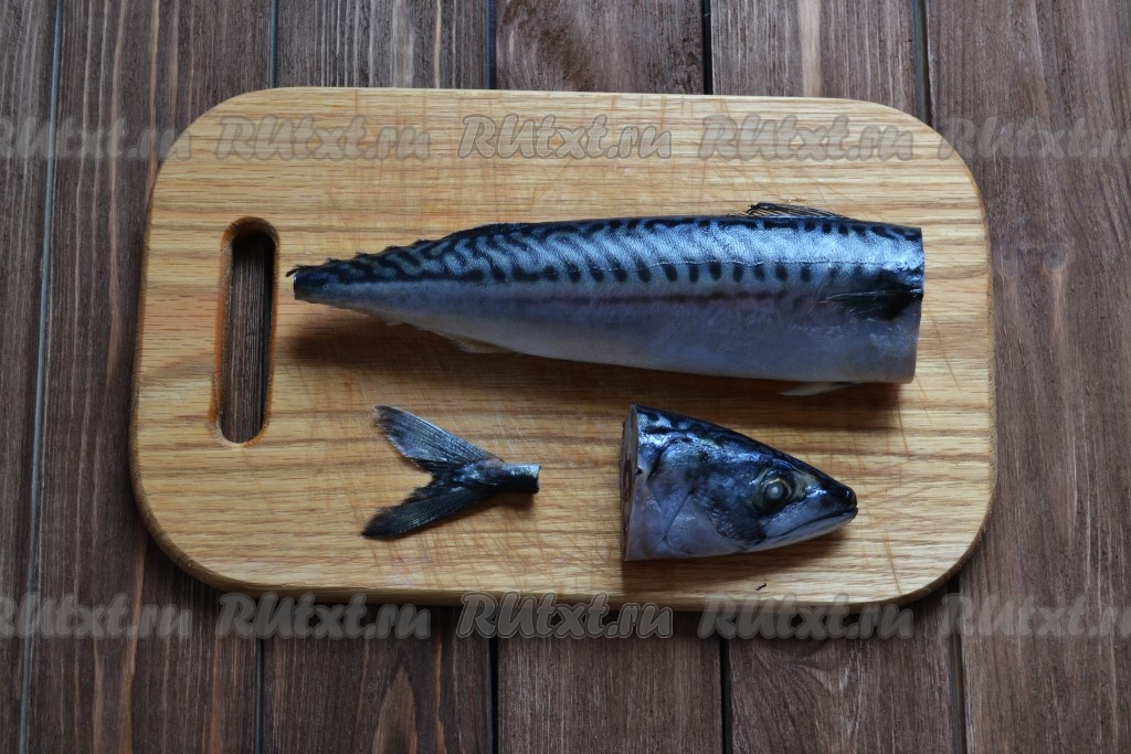 Подготовим скумбрию: отрезаем голову и хвостик, удаляем внутренности и черную пленку внутри, моем хорошо под проточной водой, обтираем салфеткой, удаляя лишнюю влагу.