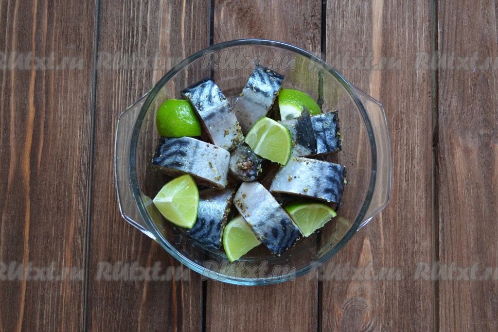 В форму для микроволновки вливаем масло - для того, чтобы не прилипла шкурка рыбы. Одной столовой ложечки хватит, далее рыбка даст свой жирок. Лайм (или лимон небольшого размера) нарезаем на 8 частей и выкладываем между кусочками скумбрии. Отправляем в микроволновку.
