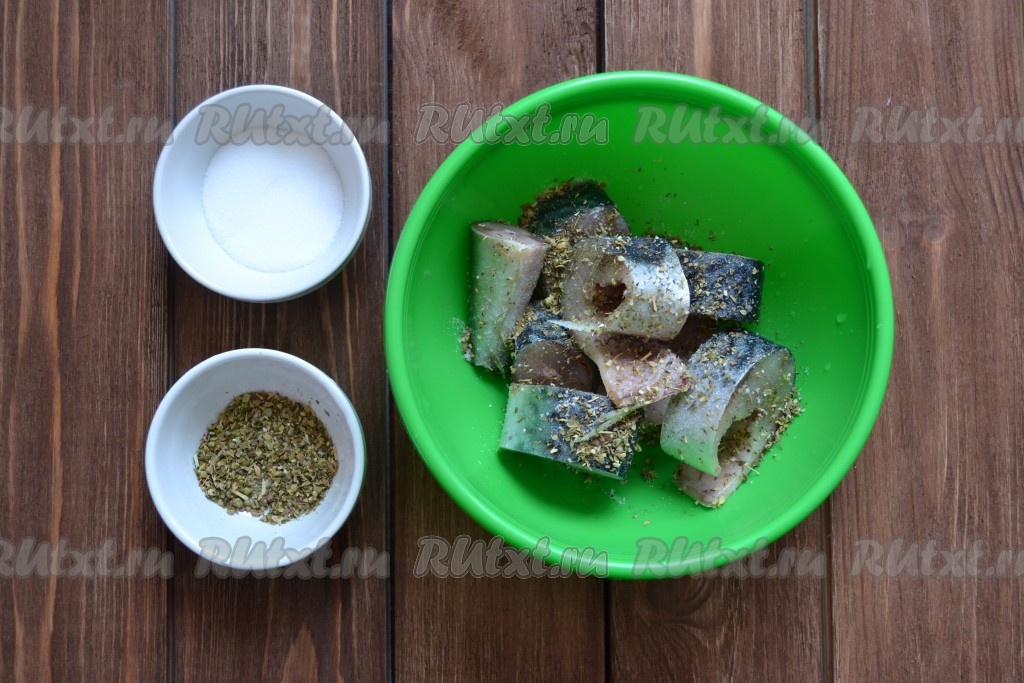 Солим скумбрию, добавляем смесь трав, перемешиваем аккуратно, чтобы все кусочки хорошо обвалялись в специях.