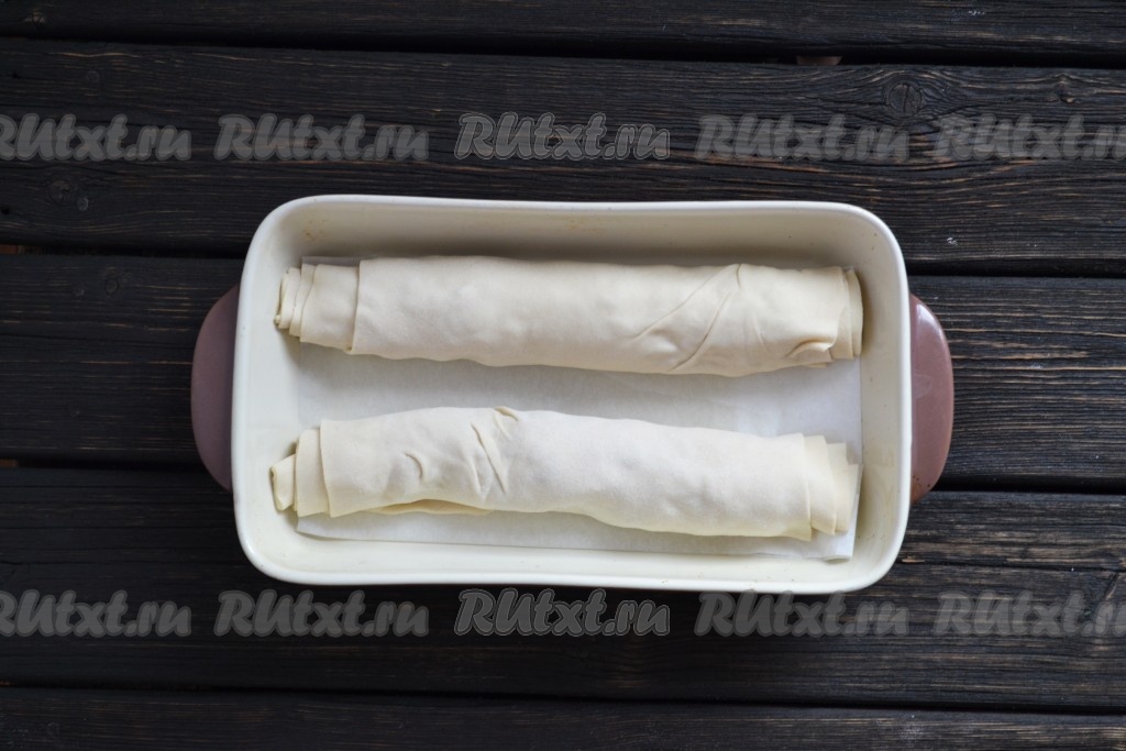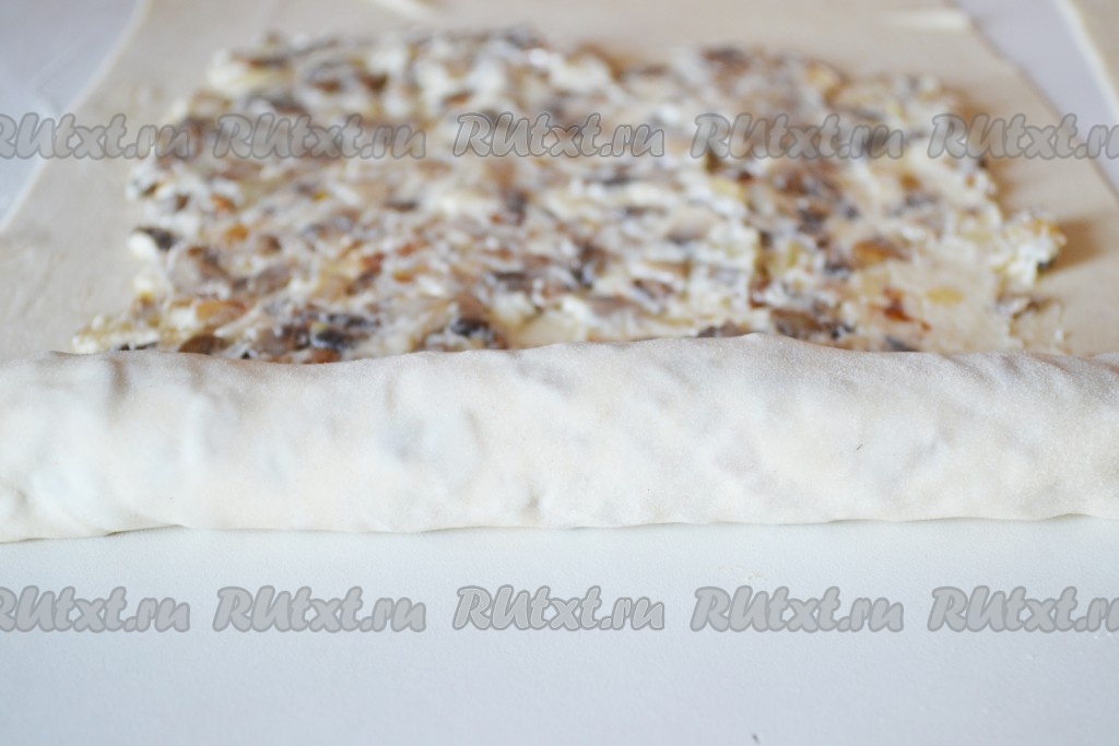 Выкладываем штрудель с грибами в форму для запекания, застеленную бумагой. Смазываем растаявшим сливочным маслом. Выпекаем в заранее разогретой духовке при температуре 200 градусов около 25 минут.