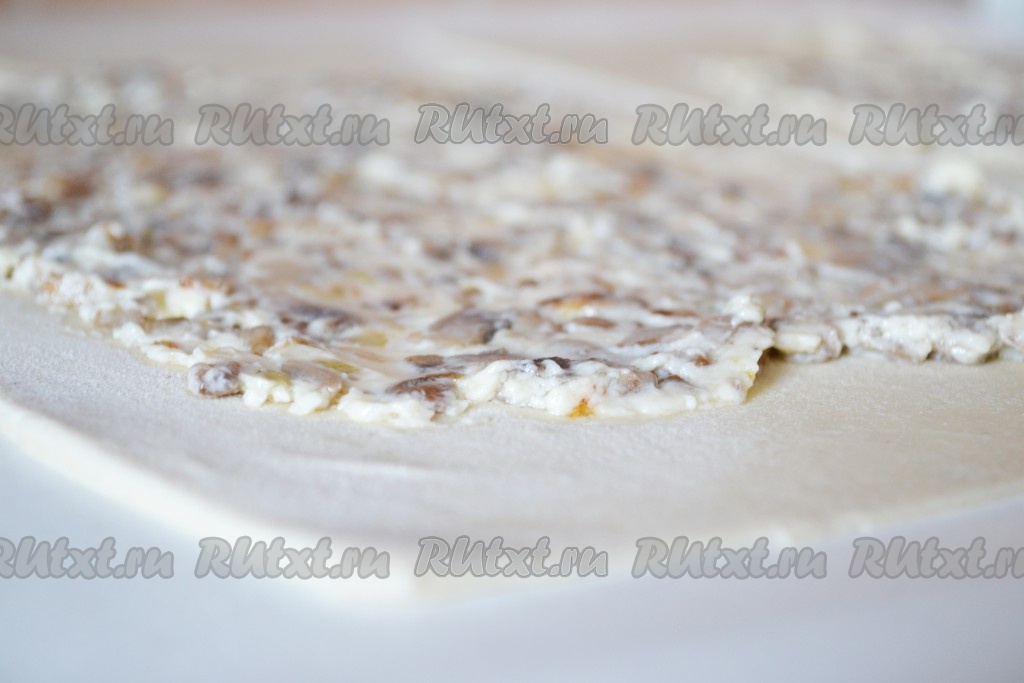 Выкладываем начинку ровным слоем, не доходя до краев 2-4 см.