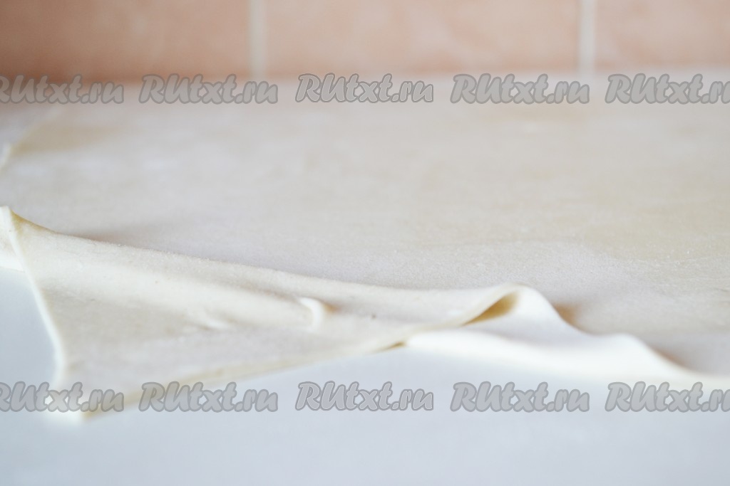 Раскатываем тесто до тех пор, пока оно не станет прозрачным. Стараемся раскатывать так, чтобы края были максимально ровными (в противном случае после раскатки нужно будет обрезать тесто, чтобы штрудель получился аккуратным и ровным).
