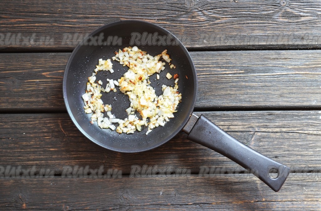 На сковороде разогреваем 1 столовую ложку растительного или оливкового масла, выкладываем очищенный лук, нарезанный кубиками, и обжариваем, иногда помешивая, до золотистого цвета.