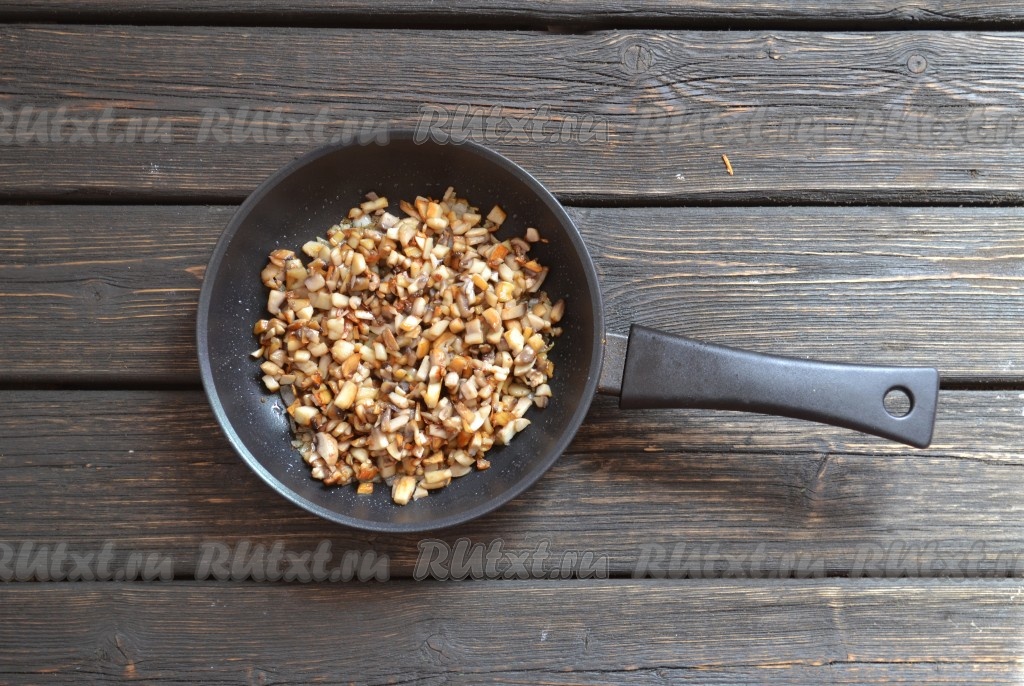 Обжариваем грибы, иногда помешивая, на сковороде, предварительно добавив 1 столовую ложку оливкового или растительного масла. Грибы должны стать золотистого цвета.