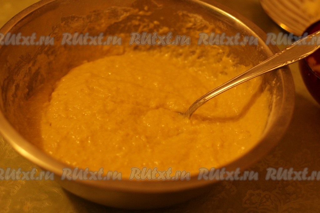 Сыворотку нагреть. Добавить к мучной смеси сыворотку и сметану с яйцом.