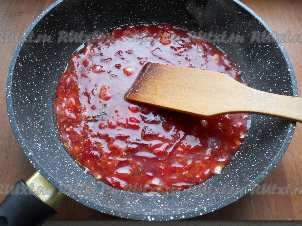 Томатную пасту развести водой и добавить в сковороду. Также добавить немного соли и сахар, перемешать. Тушить овощи с томатом минут 5 на слабом огне.