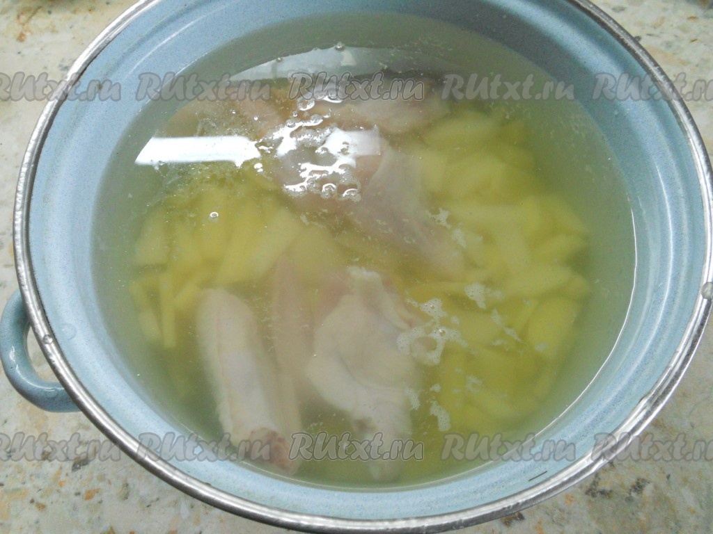 Куриные крылышки вымыть, поместить в кастрюлю и залить 3 литрами воды. Поставить кастрюлю на огонь, довести до кипения, убрать пену. Бульон посолить и варить крылышки 15-20 минут. Если используете домашнюю курицу или свинину, говядину - время варки нужно увеличить до 40-45 минут. Далее добавить в кастрюлю нарезанный кусочками картофель. Варить на небольшом огне до готовности картошки (20-25 минут).