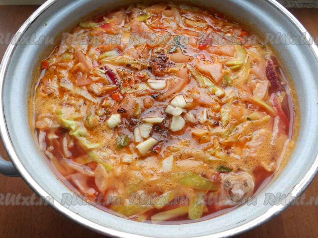 Когда картофель будет готов, добавить в кастрюлю содержимое сковороды и сразу же - нарезанную молодую капусту. Всыпать специи для первых блюд, добавить измельченный чеснок. Борщ перемешать и прокипятить его на небольшом огне еще 10 минут.