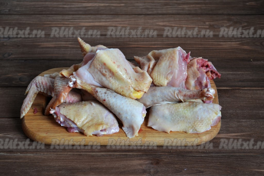 Курицу тщательно моем проточной водой и нарезаем на порционные кусочки.