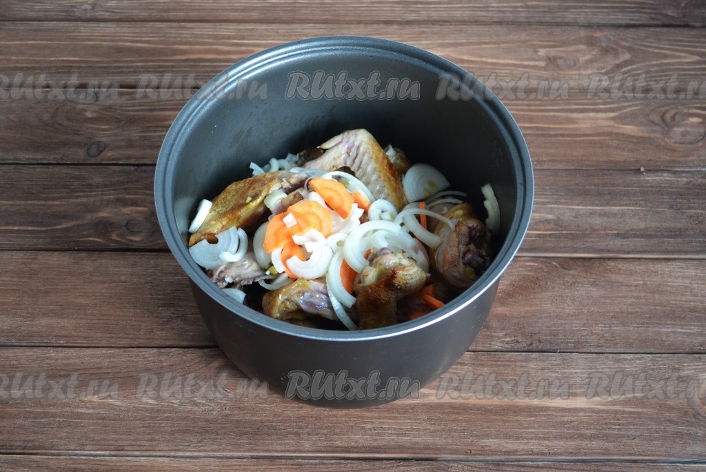 Выкладываем обжаренные кусочки курицы в чашу мультиварки, сверху добавляем лук, морковь и измельченные зубчики чеснока.
