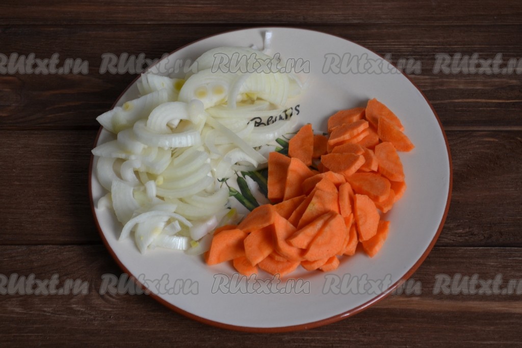 Очищаем, моем и нарезаем полукольцами лук и морковь.