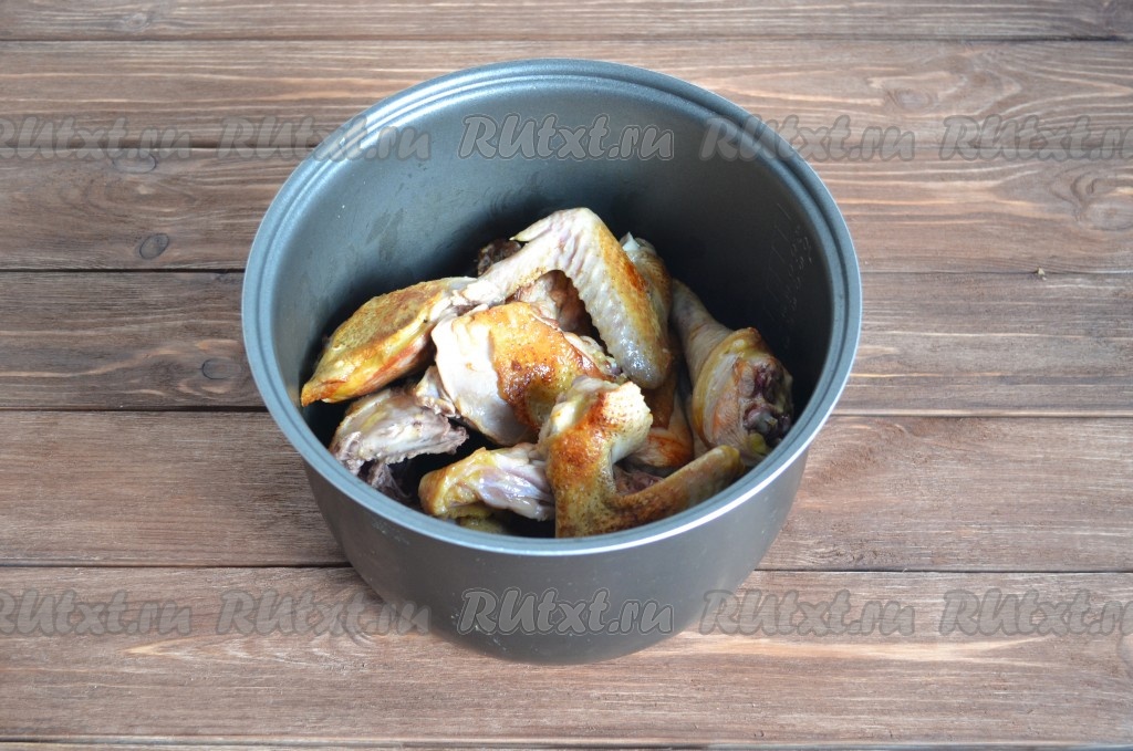 Обжариваем кусочки курицы в мультиварке на функции "Жарка" на растительном масле со всех сторон до румяной, поджаристой корочки. Жарим двумя заходами, так как мяса много, а аппетитная корочка должна получиться на каждой из частей.