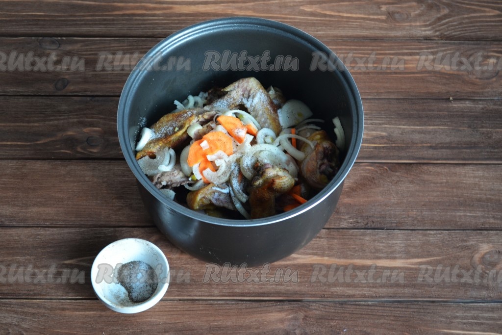 Вливаем воду и включаем мультиварку на режим "Тушение" на 1,5 часа, закрываем крышку мультиварки. Время может варьироваться, в зависимости от возраста домашней курицы. После сигнала можно попробовать, если мясо легко прокалывается или свободно отходит от кости - значит готово.