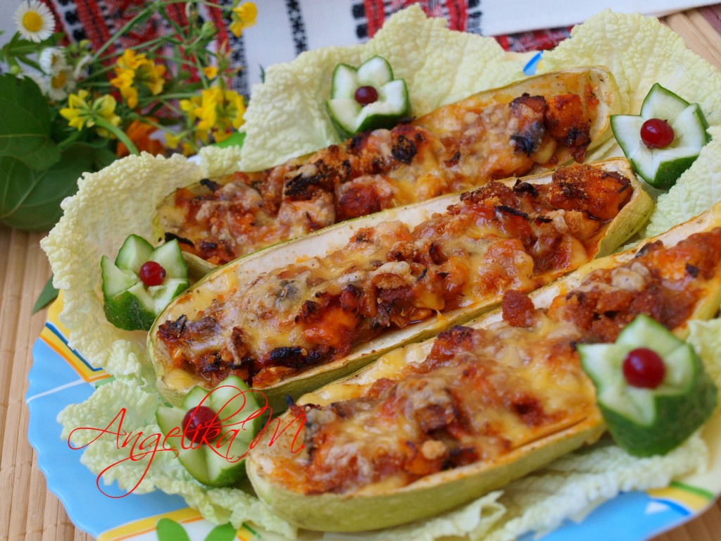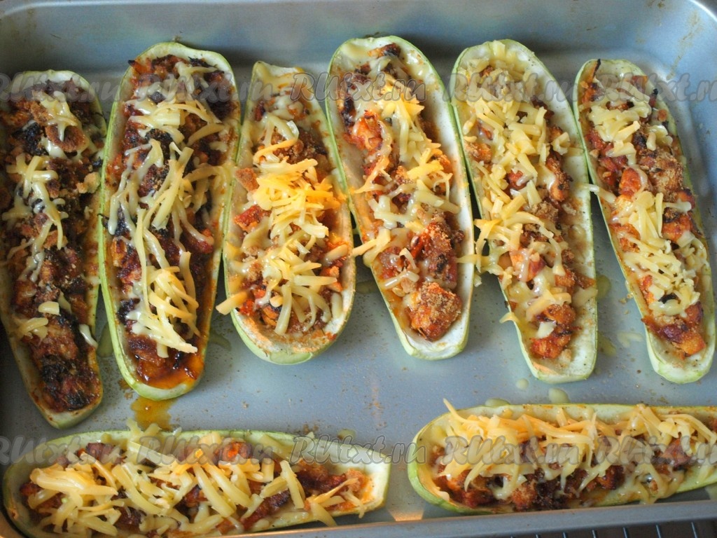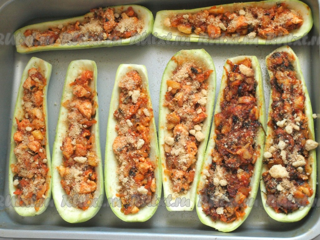 Лодочки из кабачков разместить в подходящей по размеру форме для запекания (или выложить на противень). Полученной смесью из куриного филе и овощей наполнить лодочки из кабачков. Сверху можно дополнительно посыпать измельчёнными сухариками.