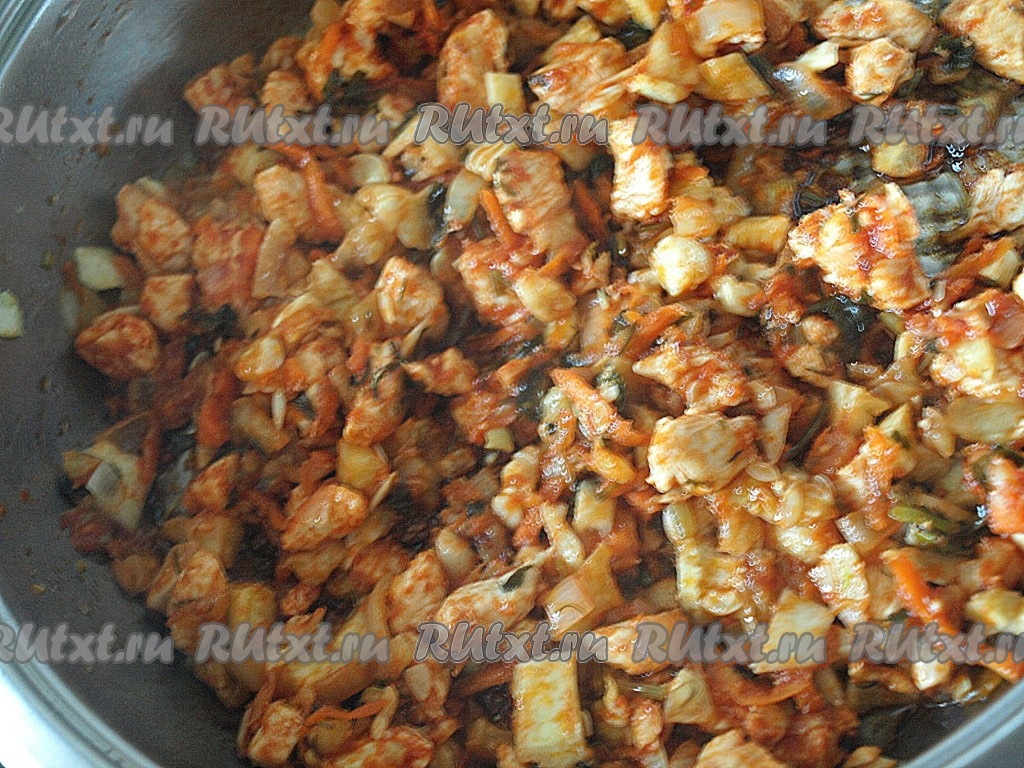 Вынутую из кабачков мякоть нарезать кубиками. Очищенный репчатый лук нарезать достаточно мелко. Морковку очистить и натереть на крупной тёрке. На разогретом подсолнечном масле на среднем огне обжарить в течение 5-7 минут морковку с луком и кабачком, периодически перемешивая овощи. Затем выложить в сковороду куриное мясо и томатную пасту. Поперчить, посолить, хорошо перемешать и потушить на небольшом огне под крышкой минут 7-10, иногда помешивая.