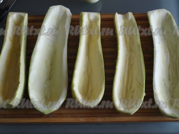 Для этого блюда лучше взять молодые кабачки с мелкими семечками. Кабачки разрезать вдоль на 2 части (с молоденьких кабачков шкурку можно не снимать). При помощи столовой ложки вынуть сердцевину кабачков (мякоть). Отложить мякоть кабачка. Получившиеся лодочки посолить с двух сторон.
