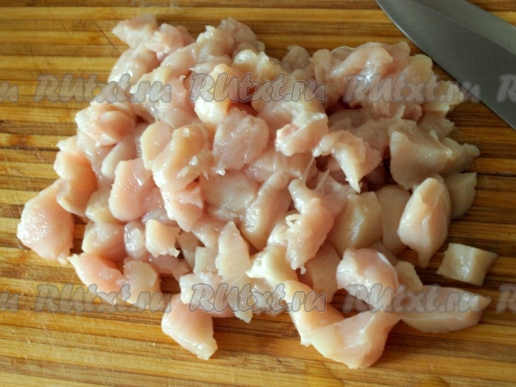 Куриное филе вымыть, обсушить и нарезать на маленькие кубики.