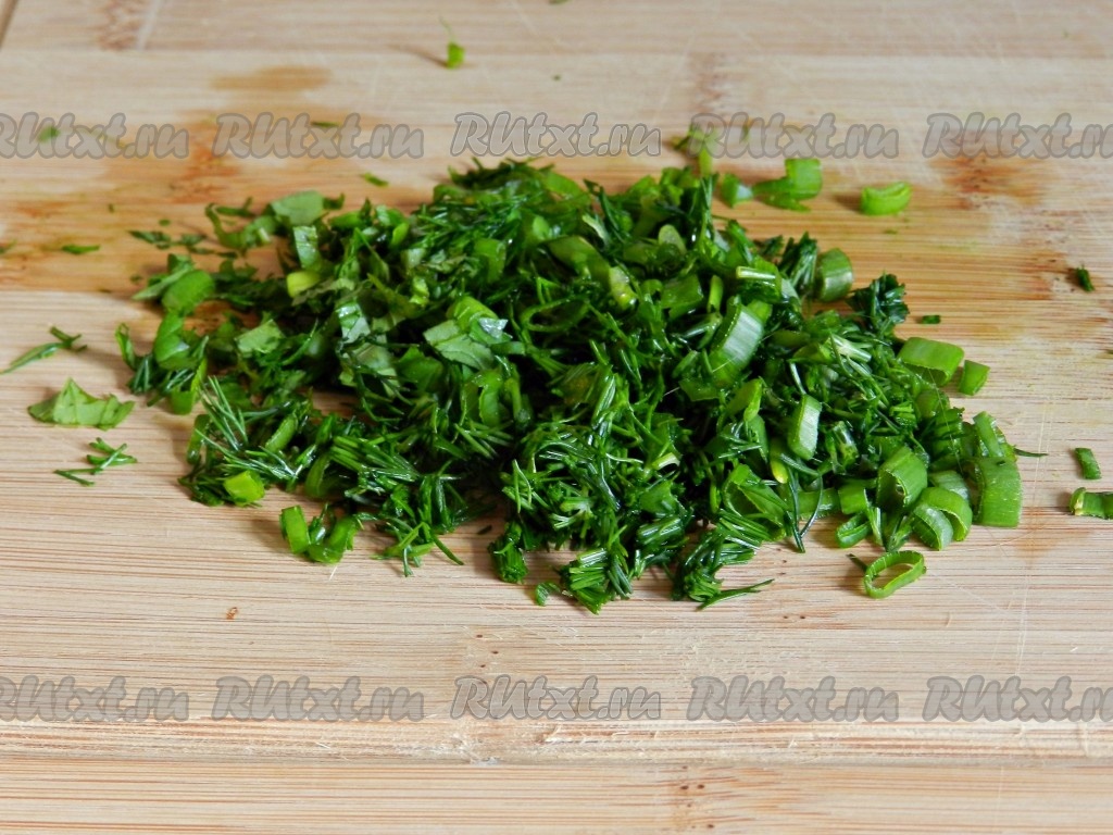 Зеленый лук, мяту и укроп мелко порубить.