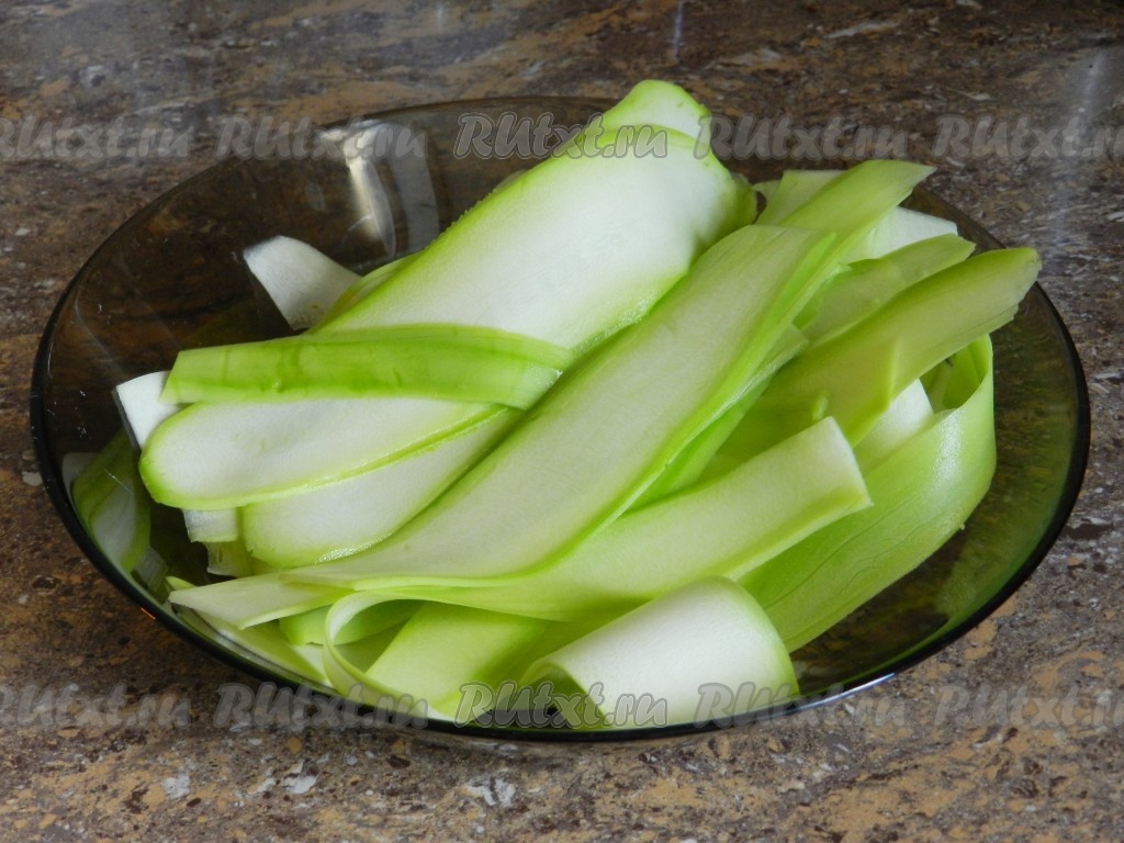 Кабачок вымыть, очистить от кожуры. С помощью овощечистки нарезать кабачок тонкими слайсами.
